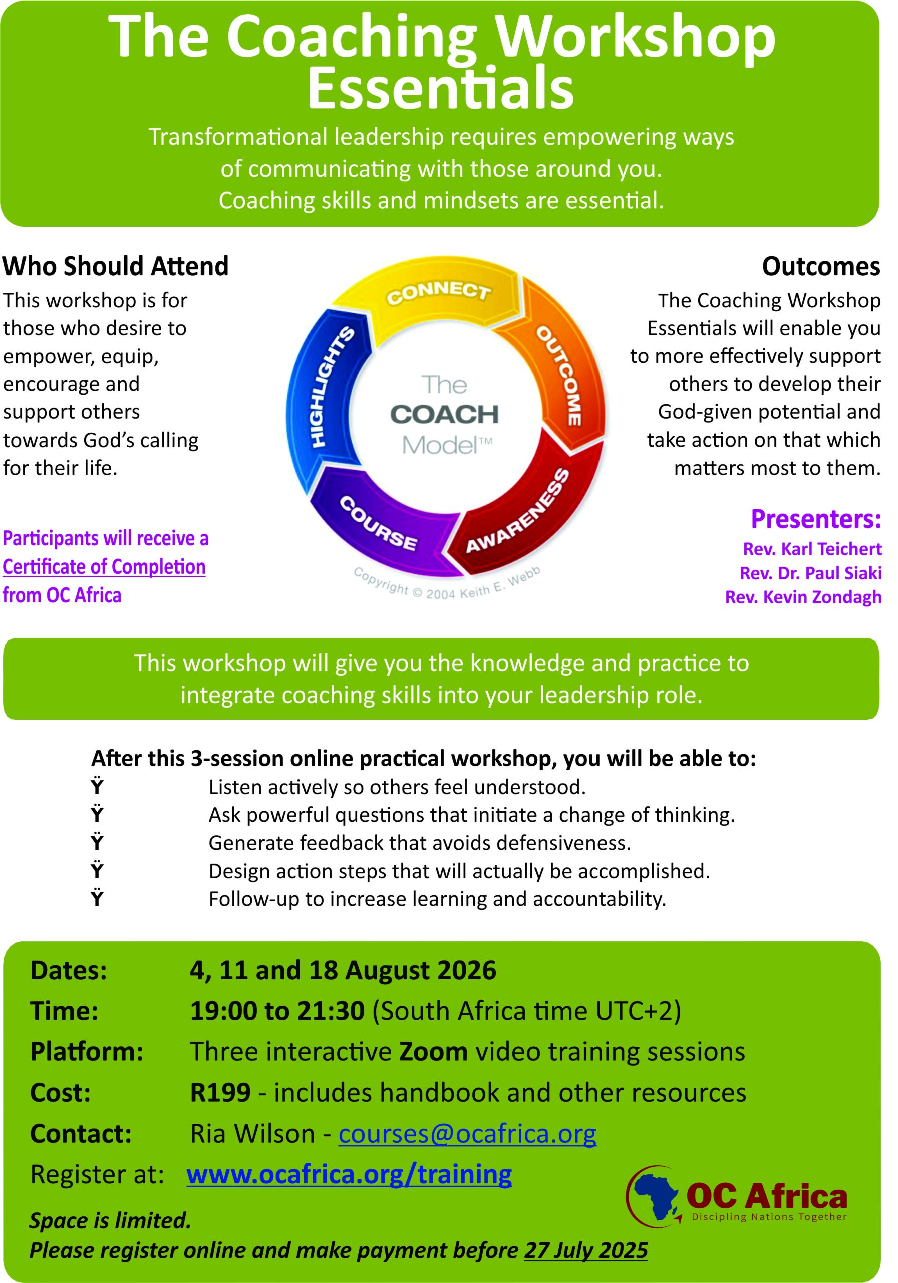 The Coaching Workshop Essentials will enable you to more effectively support others to develop their God-given potential and take on that which matters most to them.